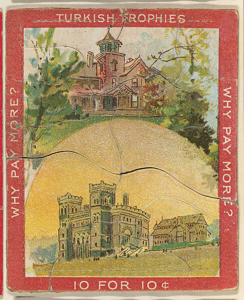 Trade card from the "Jig Saw Puzzle Pictures" series (T76), issued 1909-11 to promote Turkish Trophies Cigarettes. Each card is comprised of multiple jigsaw puzzle pieces affixed to the original album page. Cards in the set feature either red or blue borders.