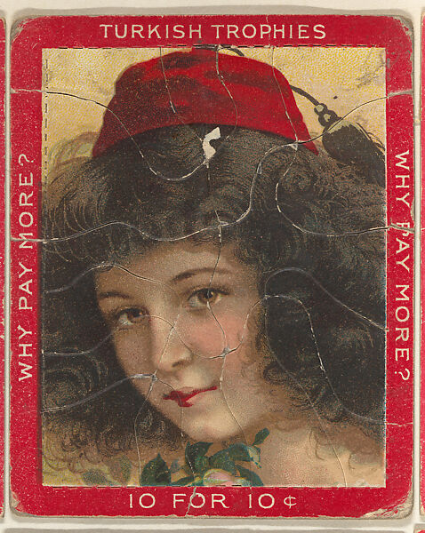Trade card from the "Jig Saw Puzzle Pictures" series (T76), issued 1909-11 to promote Turkish Trophies Cigarettes. Each card is comprised of multiple jigsaw puzzle pieces affixed to the original album page. Cards in the set feature either red or blue borders.