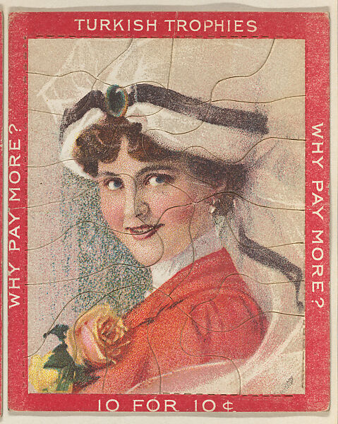 Trade card from the "Jig Saw Puzzle Pictures" series (T76), issued 1909-11 to promote Turkish Trophies Cigarettes. Each card is comprised of multiple jigsaw puzzle pieces affixed to the original album page. Cards in the set feature either red or blue borders.