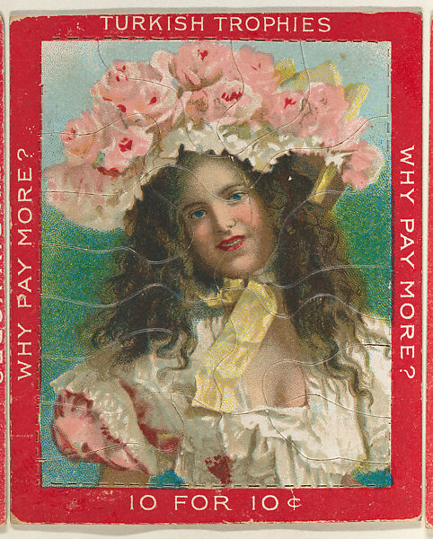 - Title:A Brunette Woman Dressed in White, Wearing a Hat Covered in Pink Flowers, from the Jigsaw Puzzle Pictures series (T76) issued by Turkish Trophies Cigarettes