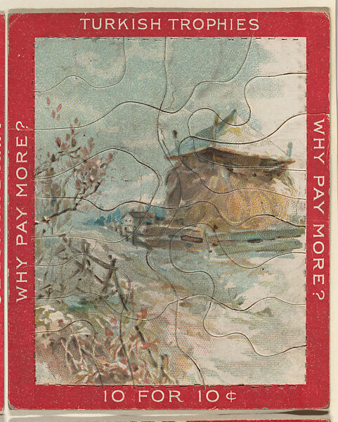 Trade card from the "Jig Saw Puzzle Pictures" series (T76), issued 1909-11 to promote Turkish Trophies Cigarettes. Each card is comprised of multiple jigsaw puzzle pieces affixed to the original album page. Cards in the set feature either red or blue borders.