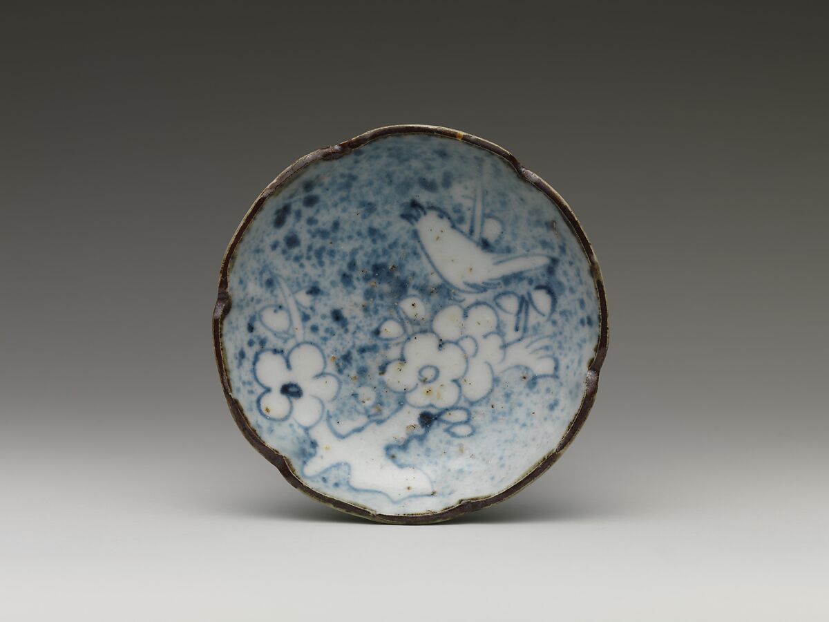 This set of small dishes represents the early phase of blue-and-white porcelain production in Arita. The painterly design of blossoming plum branches and a warbler may allude to the chapter “The Warbler’s First Song” in The Tale of Genji, which is associated with New Year’s celebrations—a notable depiction of a distinctly Japanese subject in Early Imari ware.