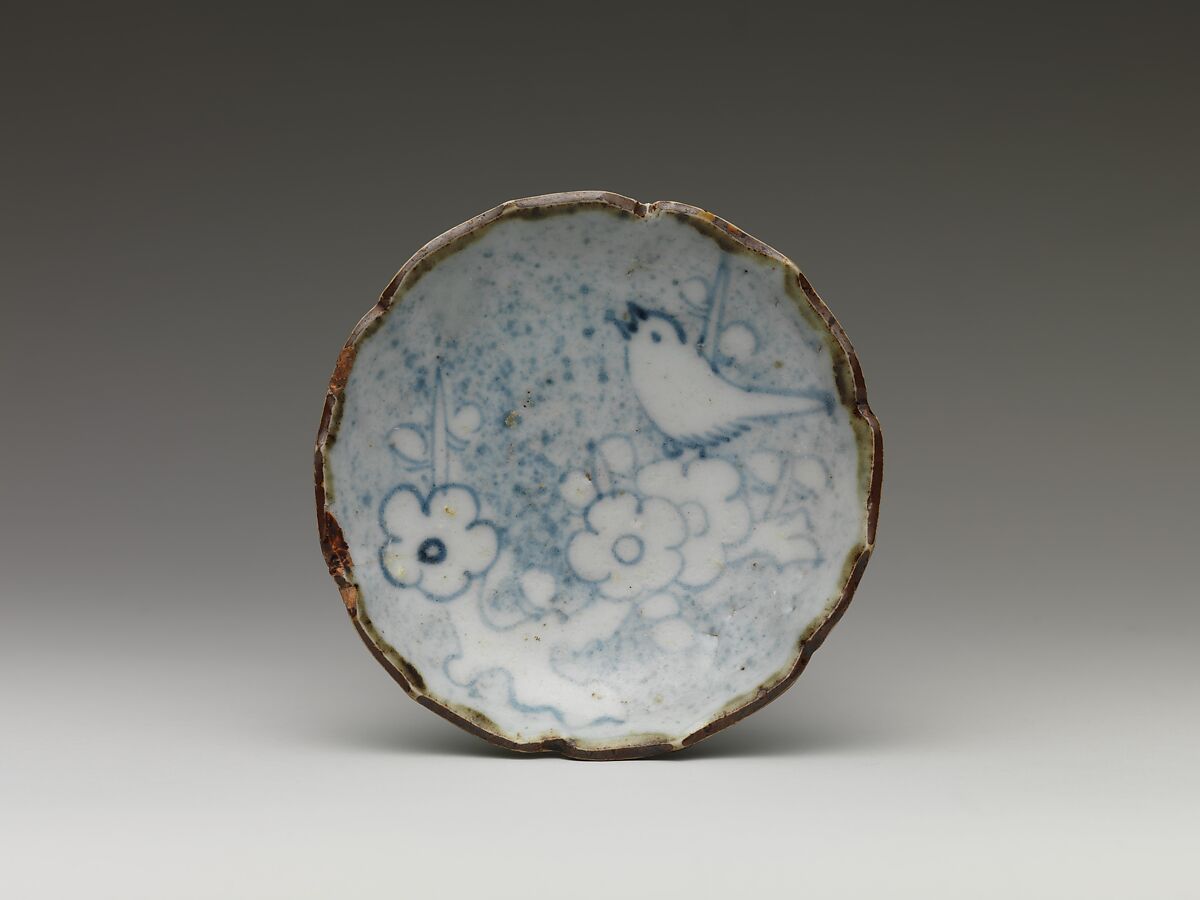 This set of small dishes represents the early phase of blue-and-white porcelain production in Arita. The painterly design of blossoming plum branches and a warbler may allude to the chapter “The Warbler’s First Song” in The Tale of Genji, which is associated with New Year’s celebrations—a notable depiction of a distinctly Japanese subject in Early Imari ware.
