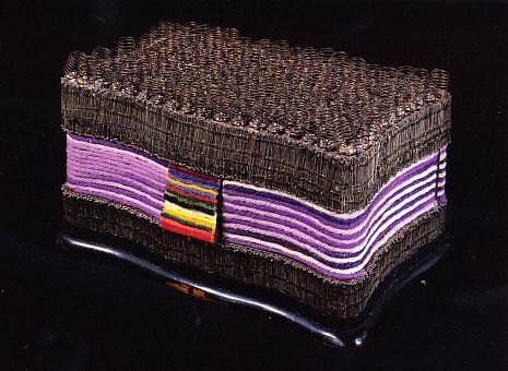 To create this work Samaras adapted a Victorian jewelry box, covering it with yarn, pins, and brass springs: "I think I was interested in the idea that when something became useless I could rescue it and give it a dignity it never had." He embedded two photographs of himself inside the lid of the box and a third beneath the pestle resting on polished rocks. A mangled fork lies atop tiny ball bearings and a plastic "L" for Lucas sits on a bed of Duco Cement caps.