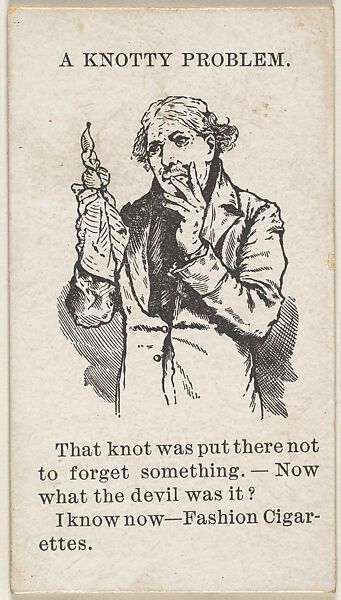 - Title: A Knotty Problem, from the Sketches series (T131), issued by F.W. Felgner Co. to promote Fashion Cigarettes
