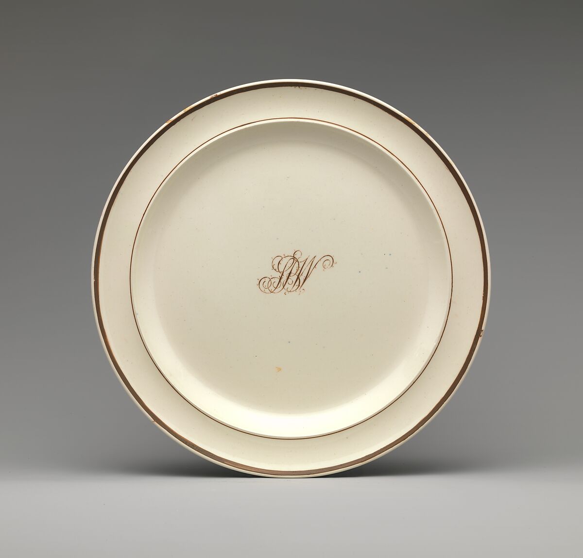 Creamware, so-called for its cream-colored body, is a refined earthenware with a lead-based glaze that was developed in Staffordshire, England around 1750. Due to its light color and glossy glaze, it was ideal for dinnerware. Economically affordable to produce, creamware was imported to America in large quantities. Although much creamware was used in America, it is rare to find pieces associated with a particular family. This dinner service (36.22.1 -.38) bears the initials “SBW” for Samuel Blachley Webb. The set was imported from England in 1774 by Webb, who was an aide-de-camp and military secretary to General George Washington.