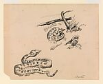 This sketch is one of dozens of drawings that Benton used to compose his mural America Today, also in the Museum’s collection (2012.478a–j). He incorporated the coiled snake at the upper right of this sheet into the Midwest mural panel, where it is hiding beneath a railing and ready to strike. The motif may allude to the danger inherent in zealous overproduction for profit—a temptation that seduced many speculators and farmers through the 1920s and caused crop prices to fall dramatically.