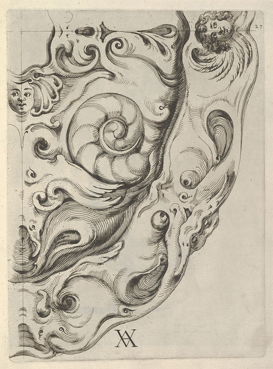 The monogram AV on the bottom left of this print identifies its maker as the Utrecht goldsmith Adam van Vianen. The print is part of the series Artful Models of Various Silver Vases and Other Capricious Work, consisting of 48 plates, published by his son Christiaen van Vianen. This print shows a quarter of what appears to be an oval silver dish. Because it is a symmetrical design, it was not thought necessary to display the dish in its entirety. With the help of two mirrors, placed on the straight lines on the left and top of the print the viewer could reconstruct the complete design. The same could be achieved by making copies by way of tracing or pouncing the print.