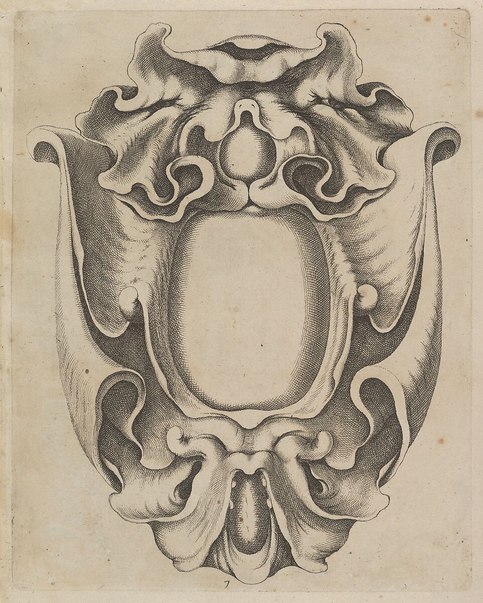 Plate 7 with a design for an oval cartouche from a series of twelve prints with designs in the Auricular Style by Johannes Lutma the Elder, etched and engraved by Jacob Lutma. The latter was responsible for the publication of the first edition of the series in 1654. This is the second edition published in Amsterdam by Frederik de Wit.