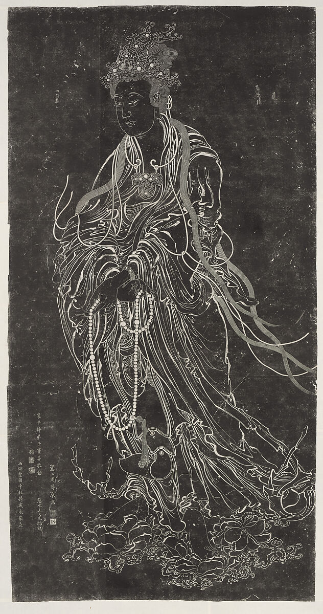 This ink rubbing preserves an image of a stone carving based on a painting. According to the inscription, the original painting was made by an artist named Zhou Xun; the stone carvers and the donor are also identified. Borne aloft by clouds, draped in flowing robes and ornate jewels, and crowned by an elaborate headdress, merciful Guanyin rides to rescue the faithful.