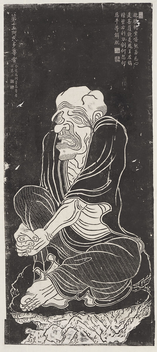 Of the many luohan painters throughout Chinese history, none was more influential than the Buddhist monk Guanxiu (832–912), whose wild caricatures inspired generations of artists to depict luohans as exotic, superhuman beings. Guanxiu’s paintings were already considered rare in 1757, when the Qianlong emperor encountered what he believed to be an authentic set in a monastery in Hangzhou. To preserve their appearance, the emperor commissioned copies and had them carved in stone so that rubbings like this one could be made. The original painting is now lost, making these copies some of the most important surviving evidence of Guanxiu’s style.