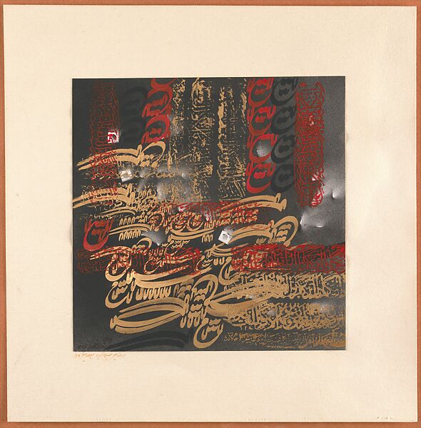 These two works on paper demonstrate Pilaram’s experimentation with calligraphy starting in the Saqqakhana years and continuing through the Revolution. The dominant gold inscriptions in shikasta script were painted, while the smaller red naskhi were stamped. While only some of the text is decipherable, the overlap, repetition, and rotation of letters allow one to appreciate the pieces as purely visual compositions as well.
