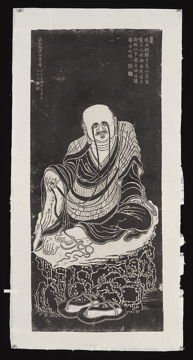 Of the many luohan painters throughout Chinese history, none was more influential than the Buddhist monk Guanxiu (832–912), whose wild caricatures inspired generations of artists to depict luohans as exotic, superhuman beings. Guanxiu’s paintings were already considered rare in 1757, when the Qianlong emperor encountered what he believed to be an authentic set in a monastery in Hangzhou. To preserve their appearance, the emperor commissioned copies and had them carved in stone so that rubbings like these could be made. The original paintings are now lost, making these copies some of the most important surviving evidence of Guanxiu’s style. Wu Bin, whose handscroll is on view nearby, was directly inspired by Guanxiu.