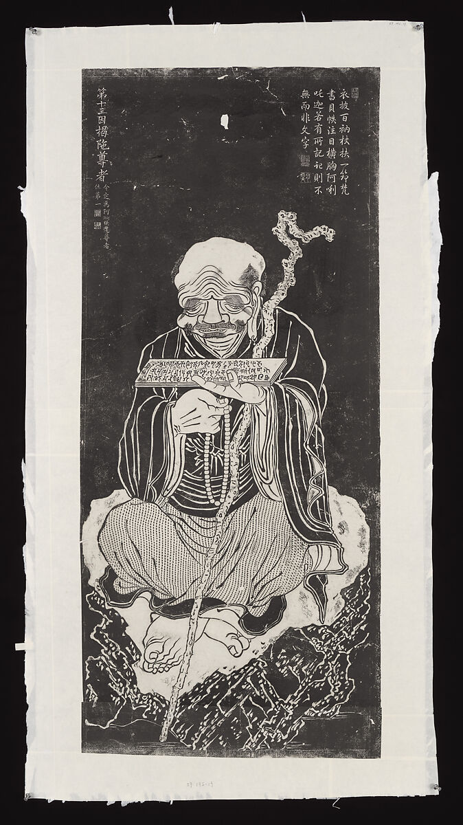 Of the many luohan painters throughout Chinese history, none was more influential than the Buddhist monk Guanxiu (832–912), whose wild caricatures inspired generations of artists to depict luohans as exotic, superhuman beings. Guanxiu’s paintings were already considered rare in 1757, when the Qianlong emperor encountered what he believed to be an authentic set in a monastery in Hangzhou. To preserve their appearance, the emperor commissioned copies and had them carved in stone so that rubbings like these could be made. The original paintings are now lost, making these copies some of the most important surviving evidence of Guanxiu’s style.