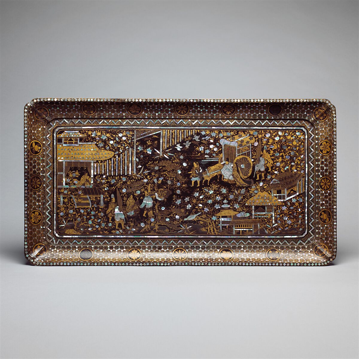 The size, geometric motifs, and extensive use of pearl shell suggest that this tray may have been intended for trade to Europe. The imagery, however, derives from the Tale of Genji, one of Japan’s most famous literary works. Written by Lady Murasaki Shikibu (ca. 978–ca. 1014), this lengthy book traces the customs of the aristocratic society and the tumultuous love life of Hikaru Genji, a distant member of the imperial family.
