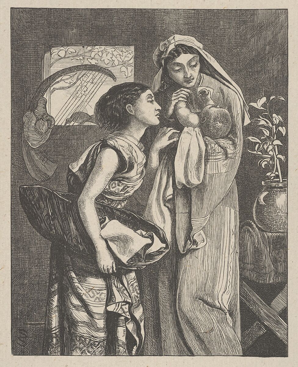 This wood engraving is based on an oil titled "Moses" that Solomon exhibited at the Royal Academy in 1860 (now Delaware Art Museum), when he was only nineteen. Part of the second generation of Pre-Raphaelites, and from a Jewish family, the artist's early subjects were inspired by the Hebrew Bible, and strove for ethnic and archaeological accuracy. The harp and pottery vessel hanging by the window, for example, derive from Assyrian carvings at the British Museum, and the features of both mother and sister were based on those of a relative, Fanny Cohen. Solomon's conception emphasizes the loving familial bonds that later will draw Moses from a life in Pharoah's court, back to assume leadership of the Children of Israel.
