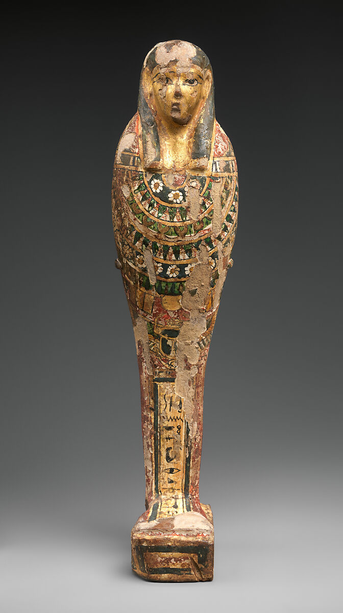 This mummiform figure resembles representations of the human-headed Imseti, one of the four sons of Horus. The manner of decoration, with gilded face, red shroud, and extravagant floral collar, is found on some Ptolemaic examples of the funerary god such as 12.182.37b, as well as on much larger Ptah-Sokar-Osiris figures like 21.9.1.