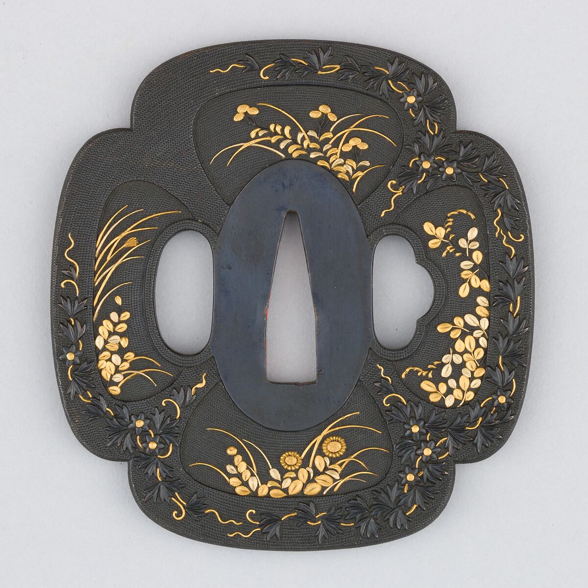 A tsuba is a sword guard and part of a sword mounting. It is mounted between the sword’s blade and grip to protect the user’s hands.