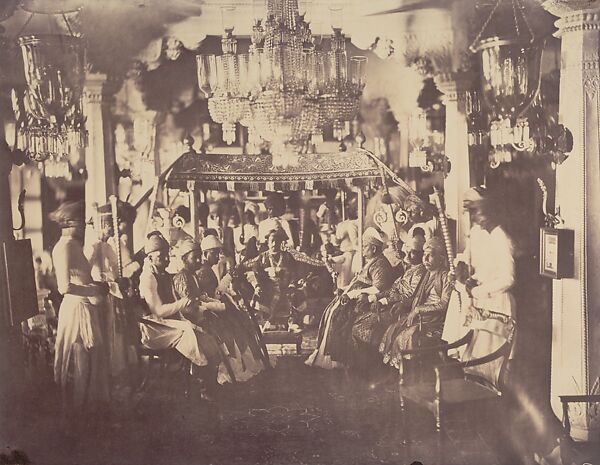This work of art is currently on loan to the museum.This photograph of a formal court ceremony shows Ramachandra Tondaiman (ruled 1839–86), raja of the princely state of Poodoocottah, enthroned beneath an elaborate canopy. Seated on European chairs are his principal nobles, including the British-appointed prime minister of Poodoocottah. Tripe captured the changed political world of the princely rulers in colonial India, who had acquired a taste for European amenities—furniture, gas lighting, and chandeliers—while seeing their power increasingly circumscribed.