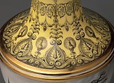 Both the technical quality and artistic innovation that characterize the best of Dihl et Guérhard’s production are evident in the Museum’s vases.[6] They are decorated with a ground of brilliant yellow, one of the colors that Dihl learned to fire successfully on hard paste, which often proved challenging in regard to ground colors. The yellow sections of each vase are decorated in black enamel with delicately rendered scrolls, peacocks, garlands of flowers, and, most prominently, with female terms, or half-length figures, alternating with birds resting in baskets of flowers.[7] This type of decoration is commonly known as “grotesque,” a reference to motifs painted in ancient Roman grottoes, which were rediscovered during the Renaissance. Grotesque decoration became popular again in late eighteenth- century France, where it was employed in either painted or carved form in fashionable interior architecture.