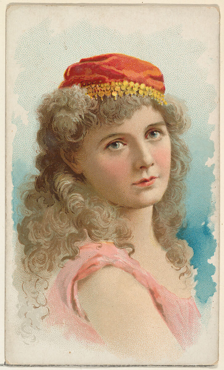 Actress wearing red silk cap with gold detailing, from Stars of the Stage, First Series (N129) issued by W. Duke, Sons & Co. to promote Honest Long Cut Tobacco
