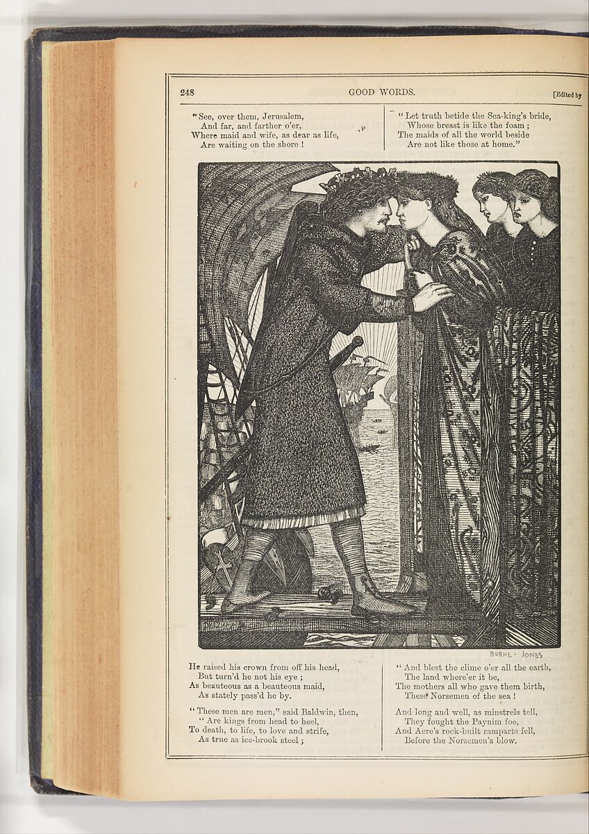 King Sigurd the Crusader is one of the many wood engravings used to embellish the first volume of Good Words. Designed by Burne-Jones at the outset of his career, the image employs deliberately simplified forms and demonstrates admiration for medieval art and the work of the artist's mentor Dante Gabriel Rossetti. The illustration accompanies Forsyth’s poetic retelling of a Norse saga and shows a young Norwegian king bidding the maiden he loves farewell as he departs on a crusade.