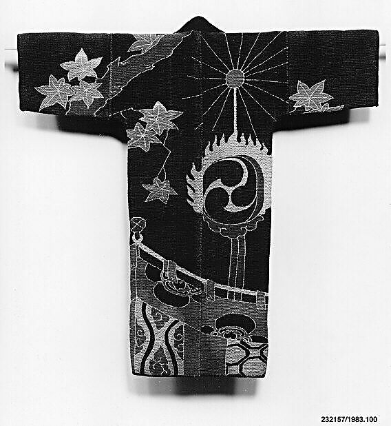 The outdoor autumnal scene on this coat features maple leaves, curtains and the taiko drum used for performances of court dance (Bugaku). The garment resembles the coats of firemen of the city of Edo, but it lacks insignia of any kind and thus cannot be identified as a fireman's jacket.