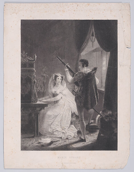This print reproduces "La Musique", a painting by Louis Ducis, exhibited at the Paris Salon of 1822 and now at the Musée Municipal, Limoges. There is a related watercolor in the Louvre. It is one of a set of four works illustrating the arts of music, poetry, painting and sculpture through pairs of famous lovers. "La Musique" shows Mary Queen of Scots and her French secretary, David Rizzio. However some prints after the Ducis painting (possibly including this one), replace Rizzio with Pierre de Bocosel de Chatelard, a previous French secretary to the queen, whose indiscreet advances led to his execution in 1536.