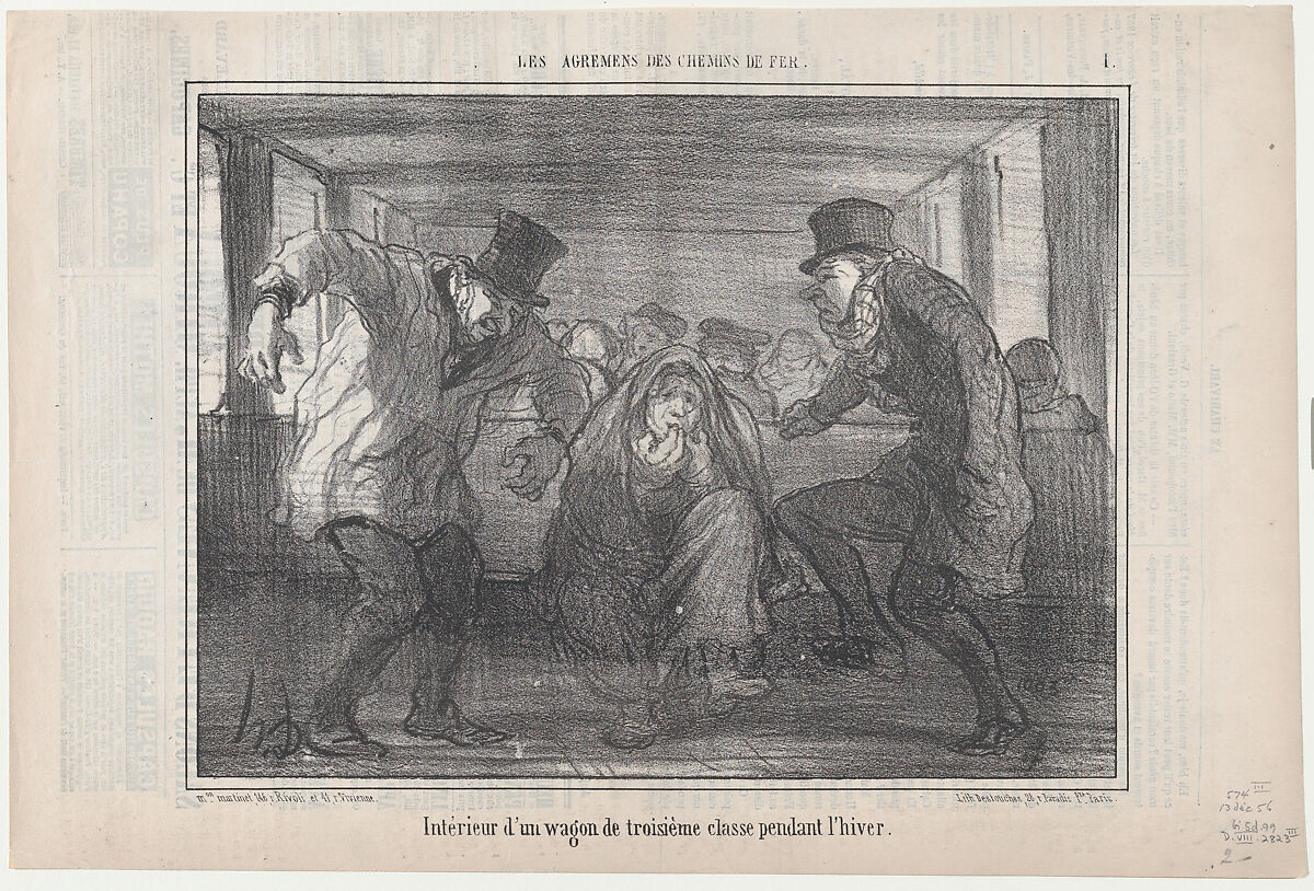 - Title:Intérieur d'un wagon de troisième classe..., from Les Agréments des Chemins de Fer, published in Le Charivari, December 13, 1856