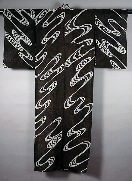 Silver streams are repeated across the panels of hemp fabric on this unlined summer kimono. The fluid swirls of water against the dark ground create a striking contrast, conveying the stylized simplicity of the Rinpa aesthetic.