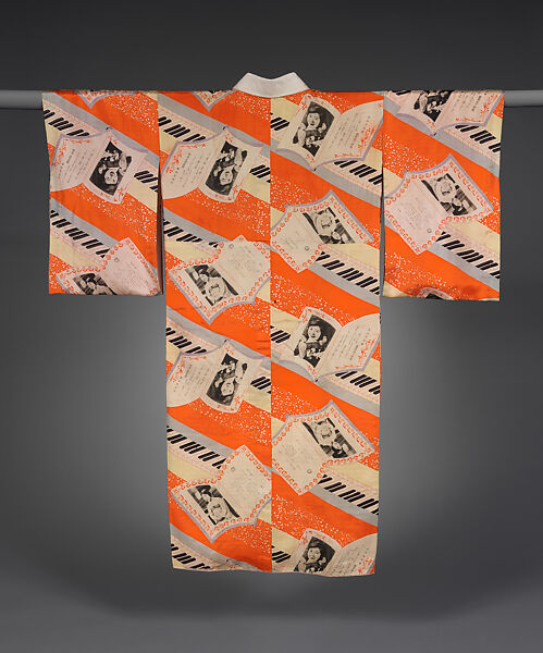 This under-kimono, an informal garment, is decorated with a set of diagonally arranged images of piano keyboards and libretti from two songbooks, including the “Lullaby of Edo” (“Edo komoriuta”), by opera singer Sekiya Toshiko (1904–1941), and the “Flowers of the Linden Tree” (“Bodaiju no hana”), by an unidentified woman named Takeko.