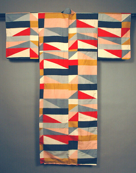 Composed of alternating triangles and rectangles in various shades of blue, white, red, ochre, and salmon pink, this meisen kimono is evocative of contemporary developments in abstract painting and reflects the openness of the Japanese textile industry to a wide variety of designs, including non-representative compositions. It was produced in the Chichibu region of Saitama Prefecture of Japan (northwest of Tokyo).