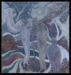 Working in Germany in the 1910s, Bloch was the only American artist who, at Vasily Kandinsky’s personal invitation, exhibited with Der Blaue Reiter ("The Blue Rider"), the Munich-based group that sought the spiritual in art. In keeping with Der Blaue Reiter’s metaphysical aspirations, Bloch’s ethereal Summer Night features silent figures moving through a moonlit landscape of rolling hills and bending trees. Tufts of grass and spots of fruit create delicate patterns, while soft mists whirl about the scene. Cool lavender blues evoke a serene atmosphere in which spirit bodies communicate purely through gesture.