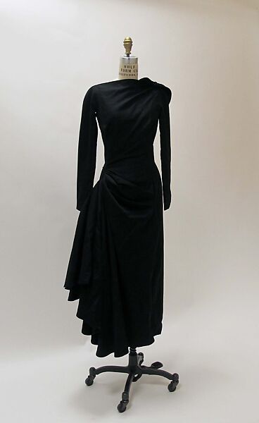 John Galliano created this draped woolen cocktail dress for his spring/summer 1995 “Pin-up/ Misia Sert” collection. The silhouette resembles a late nineteenth-century side-saddle riding habit with its skirt draped to the side of the hip. Galliano’s mastery of both cutting as well as draping techniques were featured in the collection’s silhouettes representing different female archetypes: from languid 1920s bias cut gowns to Oriental cocoon shapes to sharply cut 1950s hourglass silhouettes.