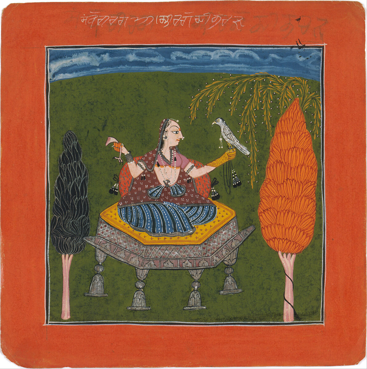 This painting, which is identified as the Sanveri Ragini by the inscription on the upper border, depicts a courtly woman seated on a silver throne in a wooded landscape. The falcon perched on her left hand is an allusion to a bird’s song. The ragamala genre in the Pahari Hill region of Himachal Pradesh diverged from that in Rajasthan, with variant iconographic subjects and different compositional solutions, as evidenced in this work’s square format and intense, flat ground color.