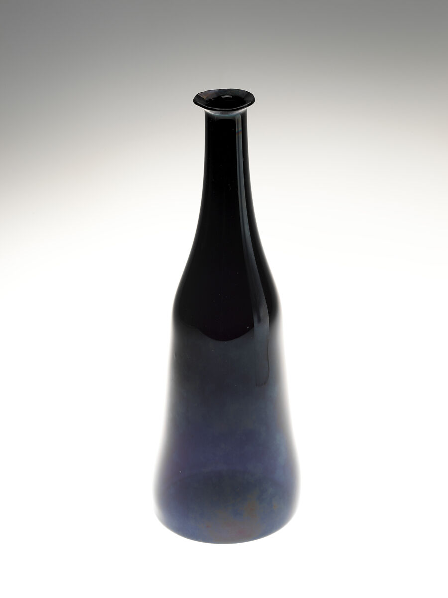 This gracefully formed sake bottle is a characteristic example of Edo-period free-blown glass. A similar vessel appears on the first advertising and wrapping paper issued by the Edo glass wholesaler Kagaya (ca. 1828), where it is labeled “lapis-blue sake-warming bottle.” Despite this source, it is unknown whether these bottles could actually have served such a purpose.