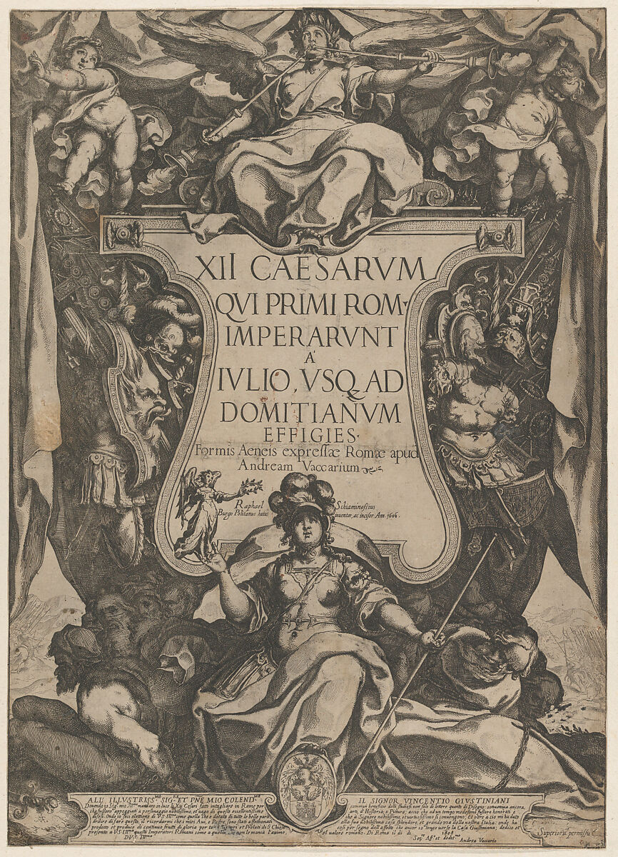 - Title: Frontispiece with a trumpeter sounding trumpets seated on top of a cartouche flanked by trophies, from 'The Twelve Caesars'