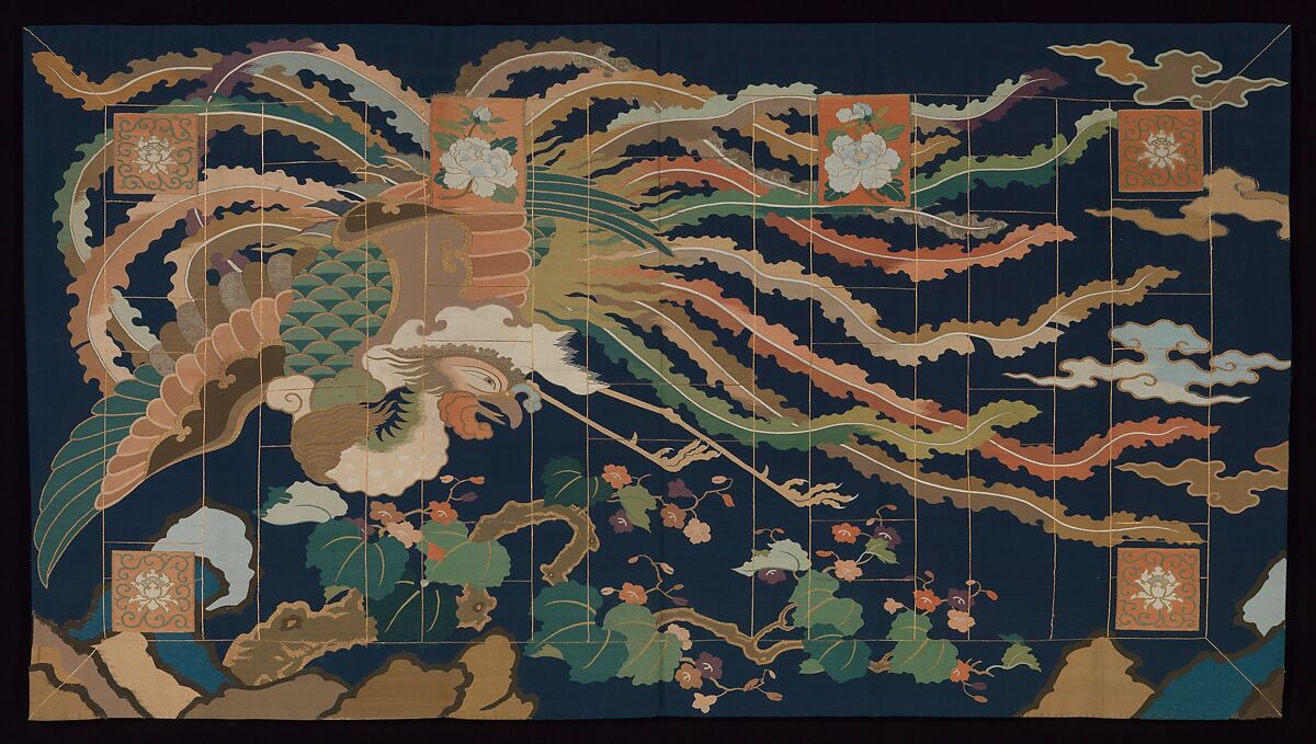 A spectacular phoenix with cascading tail feathers dominates this large tapestry-like expanse of fabric; below it is a branch of paulownia. As a motif, this fantastic creature reached Japan from China. According to Chinese tradition, the phoenix appears at times of peace and prosperity, singing in a paulownia tree during the just rule of a benevolent emperor. This is a Japanese Buddhist priest’s vestment (kesa), an outer garment usually worn draped over the left shoulder. Traditionally kesa are made of many small pieces sewn together in a configuration of columns. This kesa was woven in one piece; however, the columnar design is indicated with a cord that is sewn to the surface.