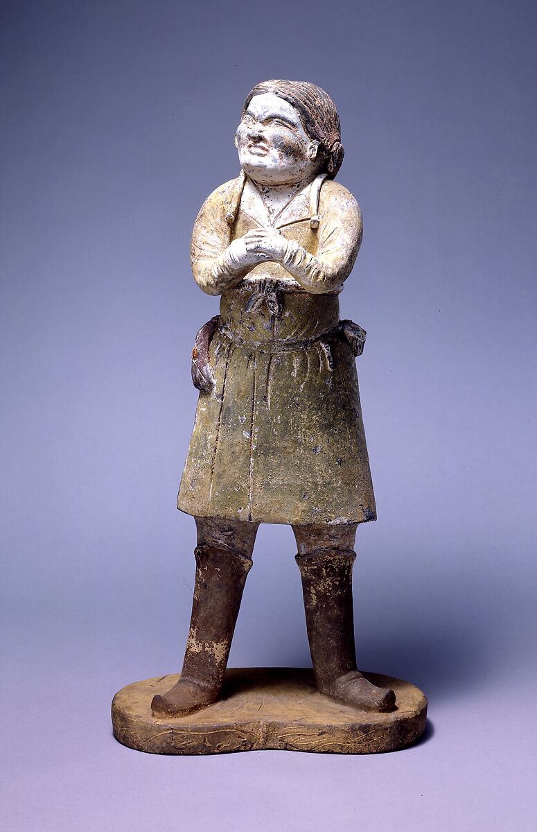 This standing attendant is likely a rare representation of a non-Han Chinese figure from the north, as suggested by his plump face with narrowed eyes, his long hair in double braids, and his costume of a tunic with wide lapels, loose trousers, and pointed boots. His belt, from which a triangular pouch, a knife, and a circular box are suspended, also reflects the nomadic way of life.