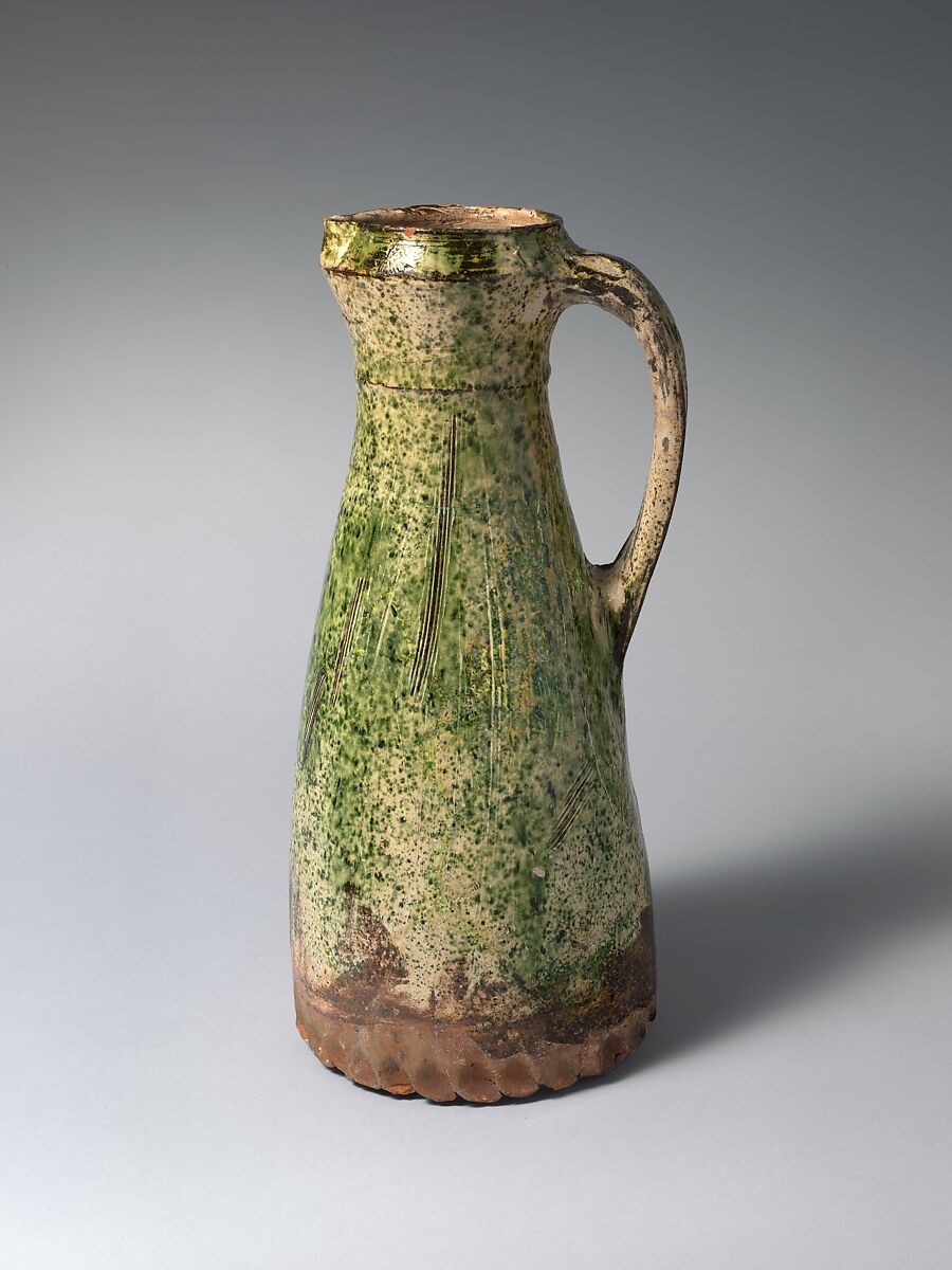 The speckled green glaze is typical of medieval ceramics from the kilns at Mill Green, about forty miles northeast of London. For about a century, beginning around 1270, potters there created tableware both for local use and for sale in the capital and at other locales within about a forty-mile radius, including Kent, Cambridge, and Hertfordshire. This jug’s thin walls reflect the skill of the ceramicist. The decorative accents—with raised ribs and incised lines—further suggest its use by a refined clientele.