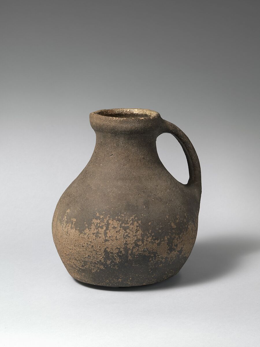 This bulbous jug is fitted with an applied strap handle that seamlessly attaches to the flared mouth rising from the tapered neck. The lip is slightly raised and grooved and is marked with a slightly pinched spout. The pitting of the lower part of the vessel has been attributed to either frost action or salt activity.