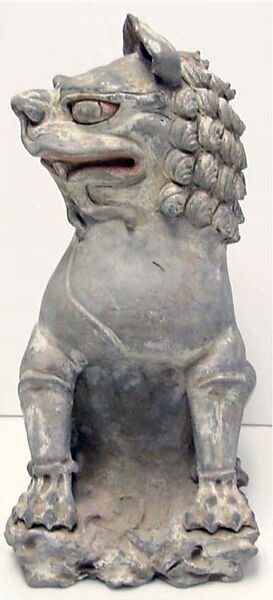 While lions are not native to China, some specimens apparently had reached there from the West by the Western Han (206 BC.–AD 9) period: there is evidence, for example, that lions were among the many exotic animals kept in the Han-dynasty imperial parks. In all probability, these two meticulously sculpted ceramic figurines functioned as bases for some kind of stand. Counterparts to these earthenware lions can be found in Tang-dynasty (618–907) stone sculpture.