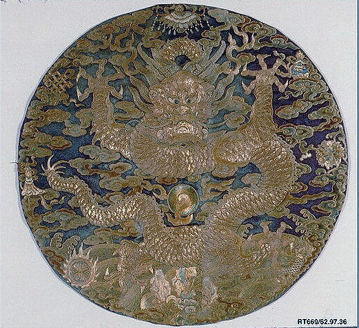 This piece is from a set of four roundels decorated the chest, back, and shoulders of a prince’s formal ceremonial garment. Each roundel bears a dragon-in-clouds pattern on a navy blue ground, and seven of the eight auspicious Buddhist symbols appear in the clouds around the edges—the canopy, endless knot, fish, lotus, umbrella, vase, and wheel. (Only the conch is missing.) The roundels for the chest and the back feature a frontal dragon (zheng long), while those for the shoulders show a dragon in motion (xing long) with its head in profile.