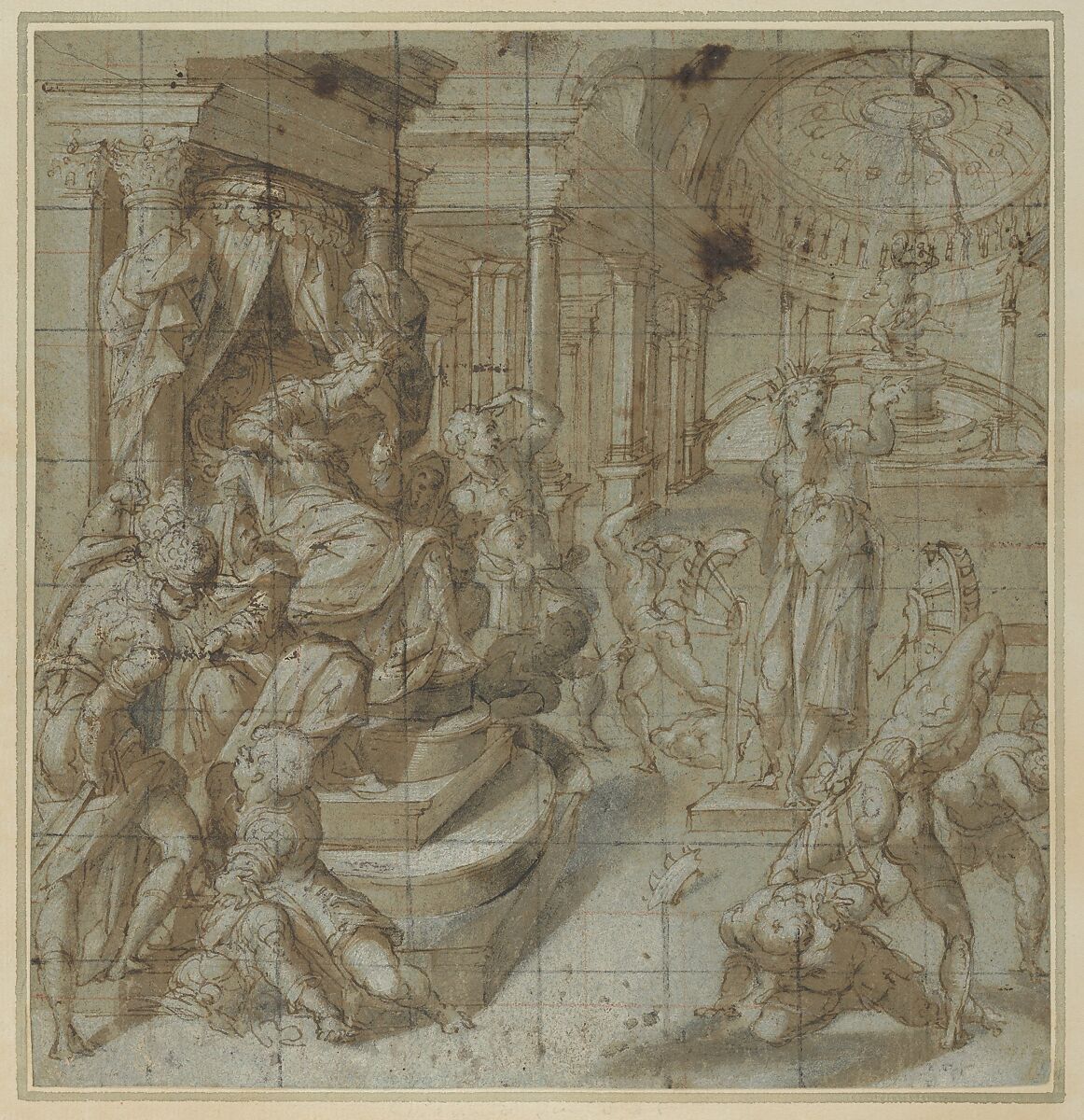 - Medium: Pen and brown ink, brush and brown wash, highlighted with white gouache, over traces of black chalk, and squared in black and red chalk