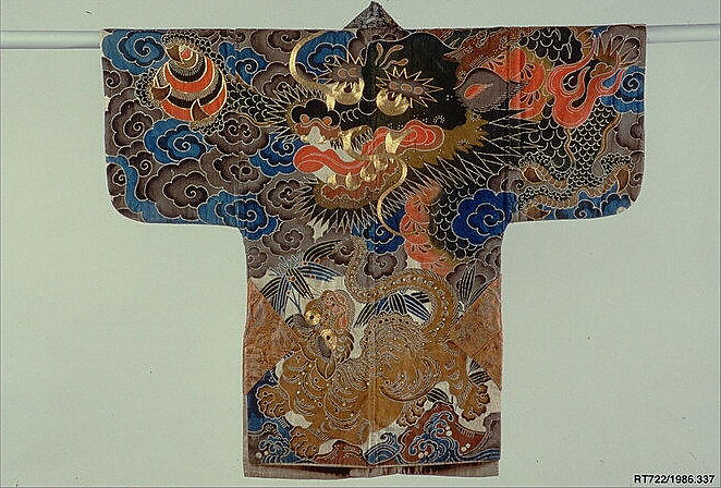 A tiger accompanies the bold dragon on this jacket. The dragon appears in the clouds above waves, and the tiger gambols among sprigs of bamboo; both associations originated in China. The front of the jacket features pine, plum blossoms, and bamboo, plants that occur together in the Chinese tradition as the auspicious "three friends in winter" because they bloom or remain green even in the cold. It is thought that a similar jacket may have been worn for a festival or regional theatrical performance in the San'in district located on the Japan Sea side of the main Japanese island of Honshu.