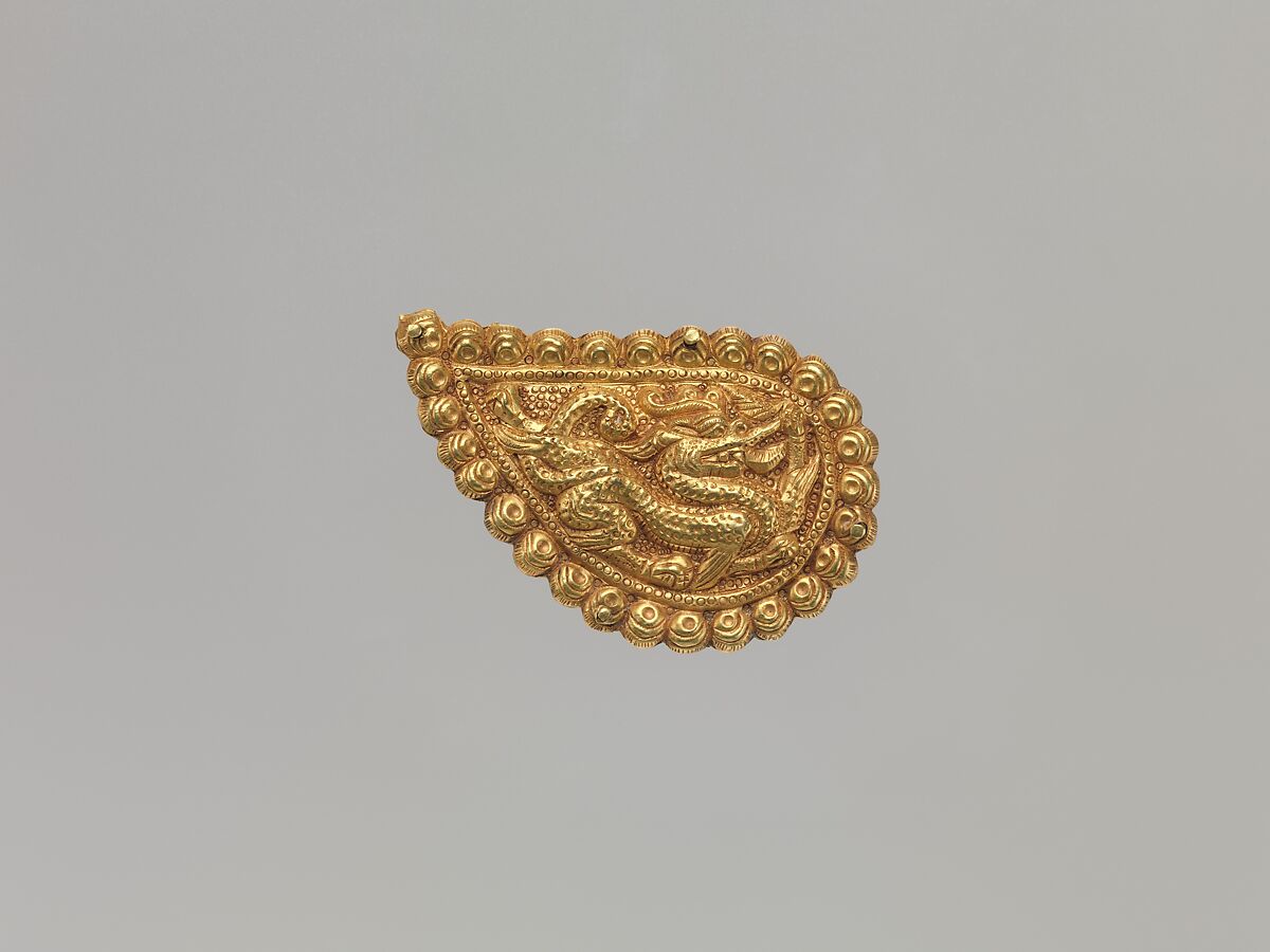 The nomadic communities of Central Asia used such plaques to embellish clothing and horse trappings. As these nomadic cultures herded animals and were constantly moving, their artistic production was expressed in portable objects that marked the wearer’s status and wealth. The outstanding preservation of these fragile ornaments suggests they were used in conjunction with burials, where the body was aggrandized with valuable textiles and augmented with gold. Although it is difficult to date and place these objects geographically, their presence in Central Asia and has a long, established history.