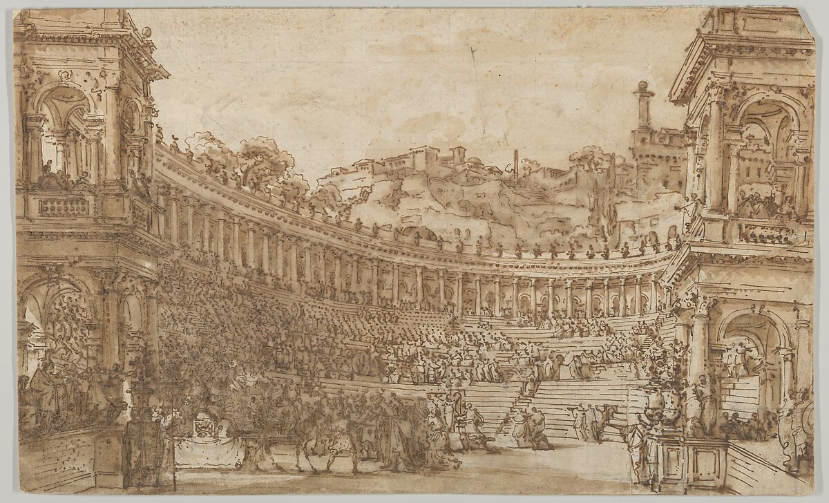 This drawing appears to represent an ancient theater in a style influenced by the many ruins Desprez studied during his travels across southern Italy and Sicily that he undertook with Dominique-Vivant Denon, Claude-Louis Châtelet and Jean-Augustin Renard in 1777. It depicts an amphitheater on a rocky hillside filled with figures in classical dress. Crowds are gathered around a seated figure who is wheeled in from the left on a platform pulled by a horse. The fluid penwork and squaring in black chalk indicate that the sheet was a première pensée, and indeed the design became the basis for a large and ambitious drawing executed in watercolor and gouache, today in the Canadian Centre for Architecture in Montréal. The drawing in Montréal was published in 1993 with the title The Triumph of Hannibal and may have been intended as a stage design for Gustav III in Sweden.