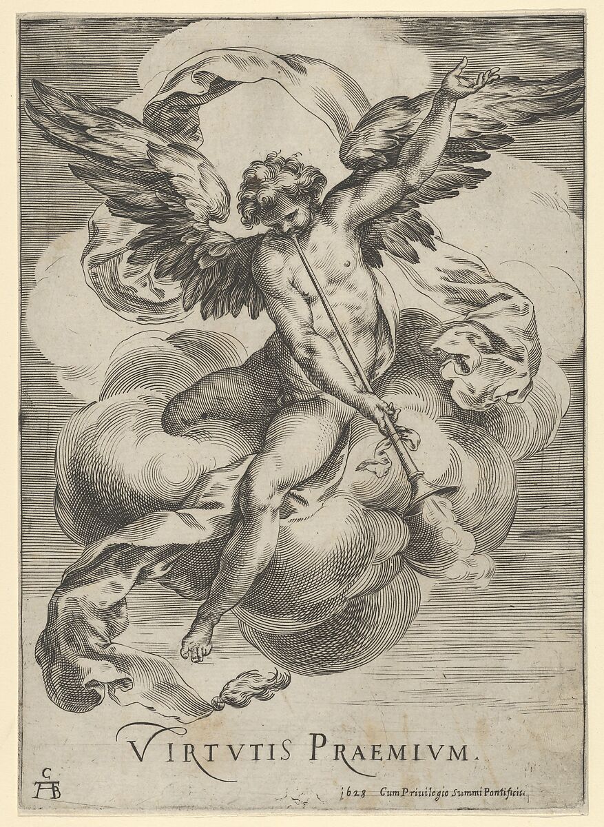 - Title: Winged genius seated on a cloud, sounding a trumpet with his left hand extended upwards