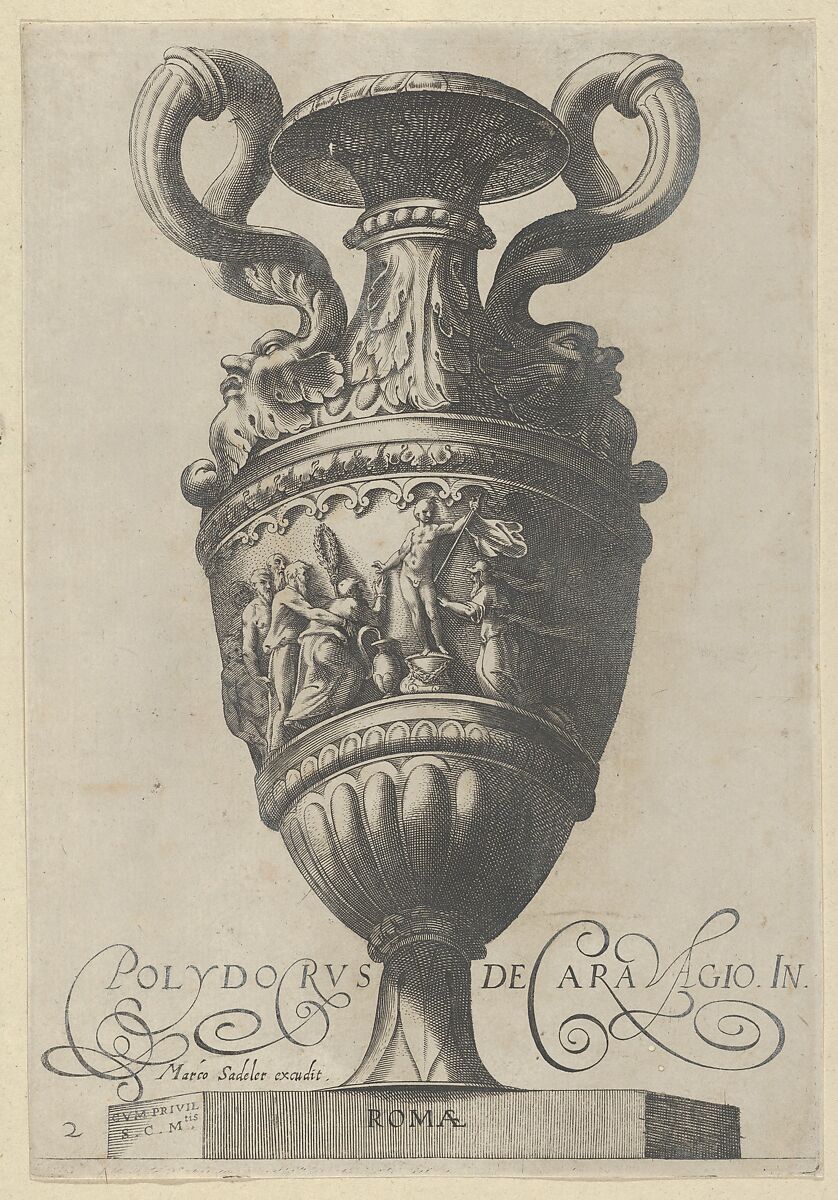 - Title: Plate 2: Two-handled vase with a nude figure on a pedestal at center, from "Antique Vases" (Vasa a Polydoro Caravagino)