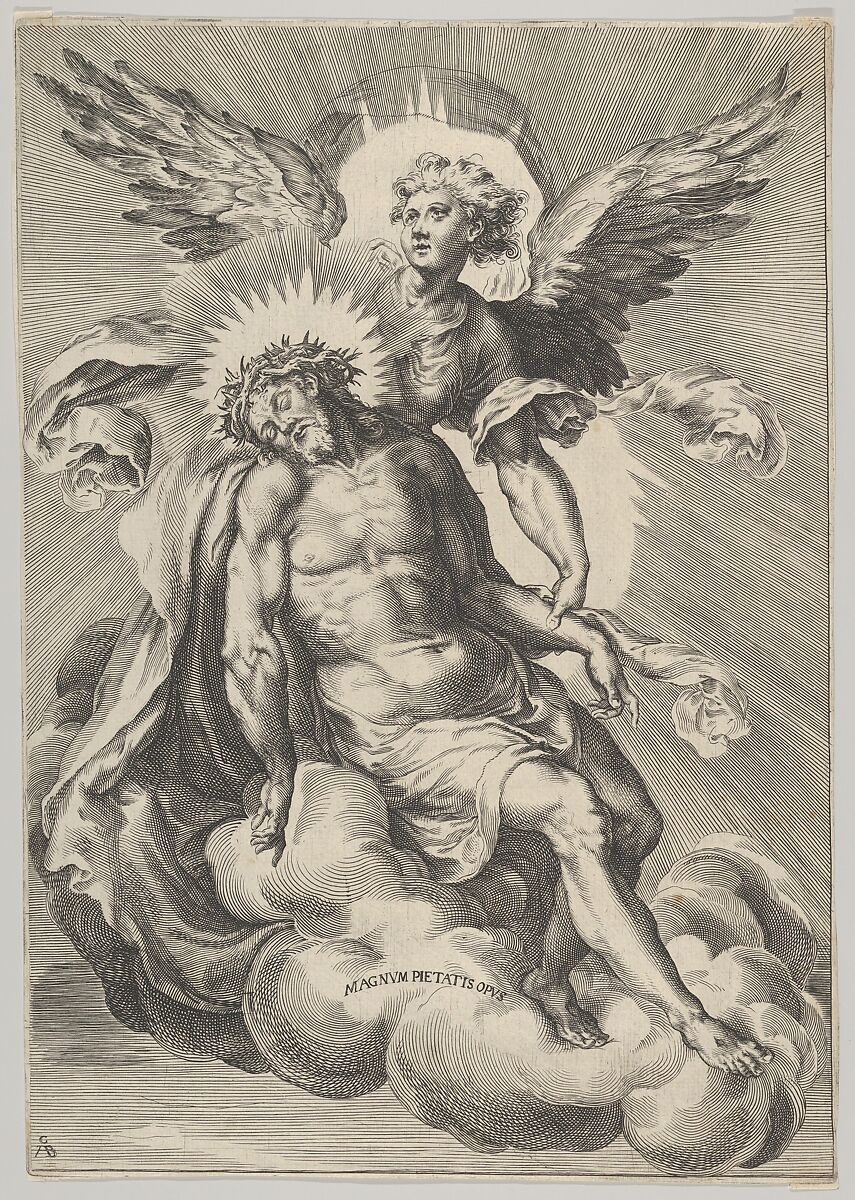 Christ supported by an angel standing on a cloud with light radiating behind them